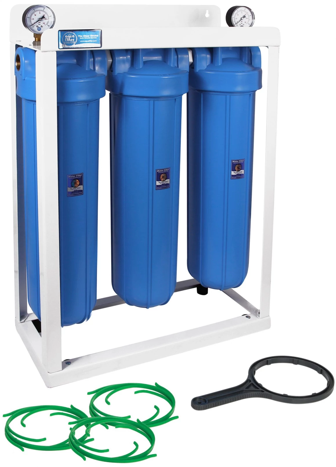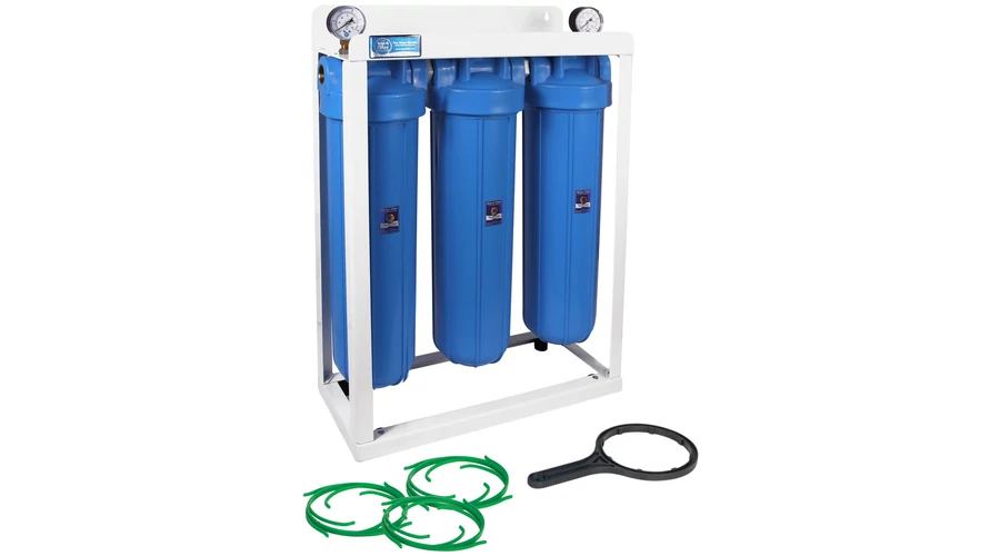 A központi szűrőrendszer 3 darab 20″ Big Blue szűrőházat és 2 darab nyomásmérő órát tartalmaz. A víztisztító szűrőrendszer különböző szűrőbetétek