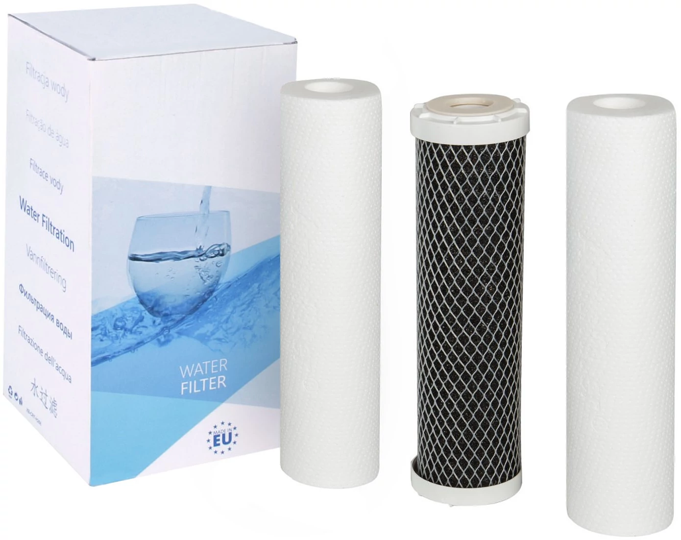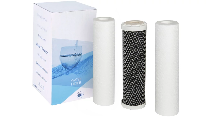 Az Aquafilter FP3-CRT szűrőbetét készlet azt a három előszűrőt tartalmazza, amit 3 – 6 havonta javasol cserélni a gyártó a legtöbb RO készülékben,
