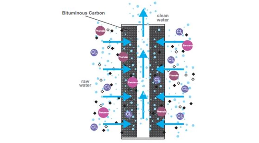 A tisztítandó víz behatol a szűrőbetétbe a blokk külső felületén. A klórt és származékait a felszínén tartja, míg a tisztított víz áthalad a blokk belsejébe.