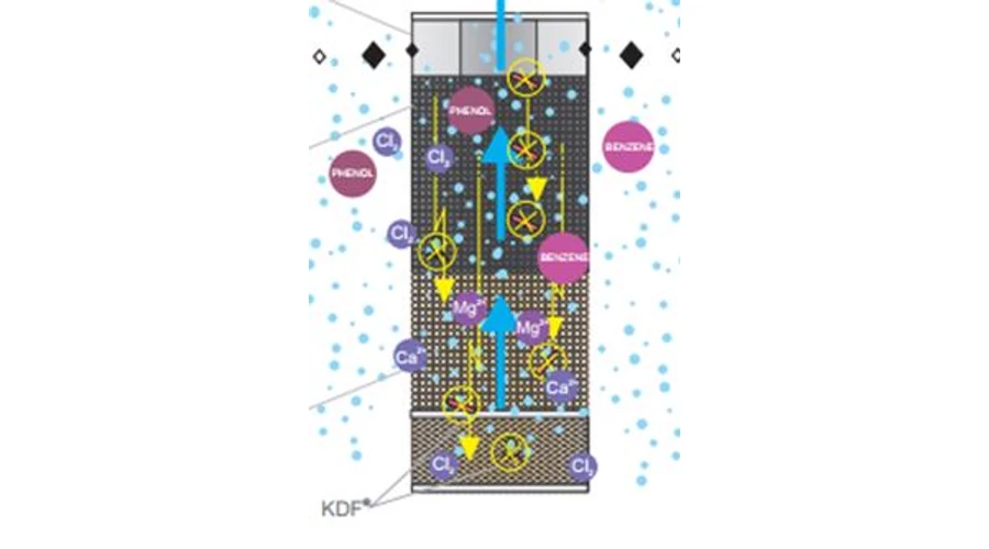 Az első szűrési réteg a KDF, ez eltávolítja a hidrogén szulfidot, növényvédő szereket, a vasat és csökkenti a nehézfém koncentrációt