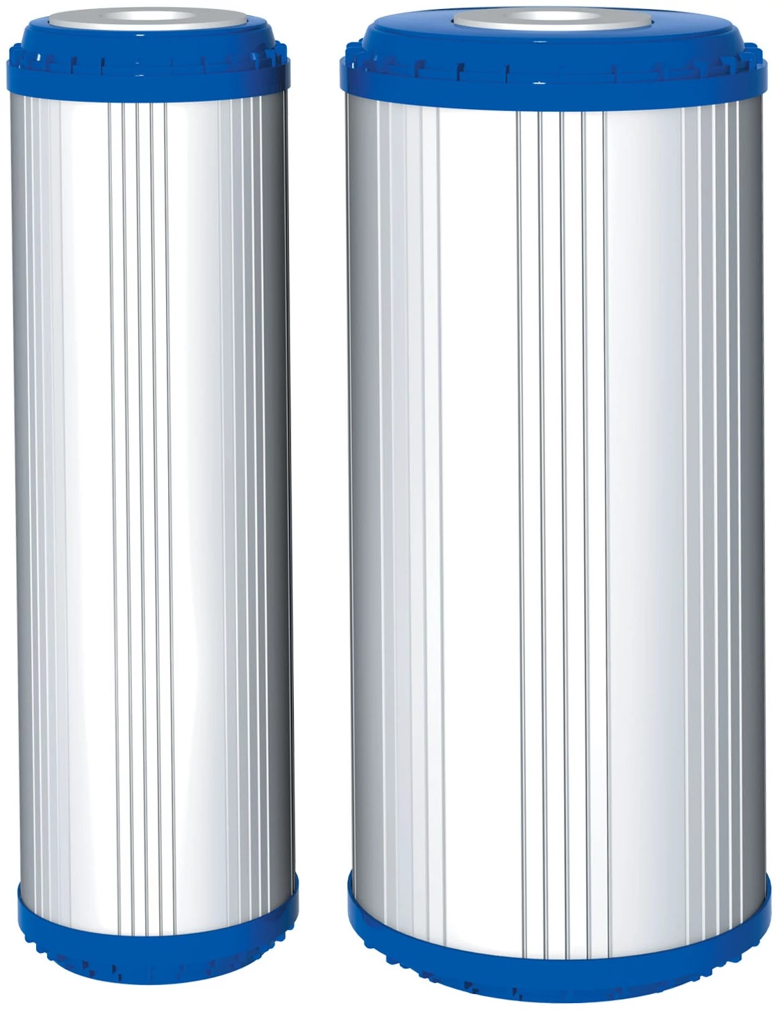 FCCBKDF210BB, 10" Big Blue méretű, UDF típusú, három rétegű szűrőbetét. A szűrőbetétben KDF betét, vízlágyító réteg és kókusz héj aktív szén réteg található.